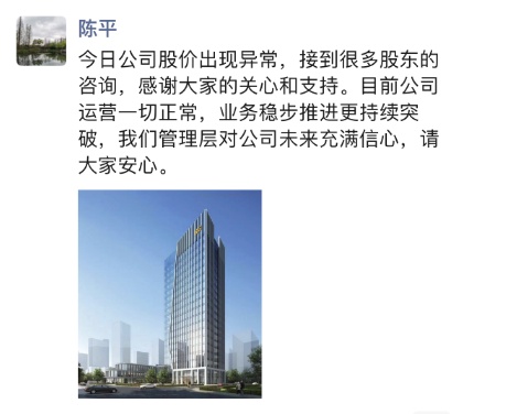 智通财经APP注意到,当天15:43分,润歌互动董事局主席兼执行董事陈平在微信朋友圈发言,称:“今日公司股价出现异常,接到很多股东的咨询,感谢大家的关心和支持。目前公司运营一切正常,业务稳步推进更持续突破,我们管理层对公司未来充满信心,请大家安心”。