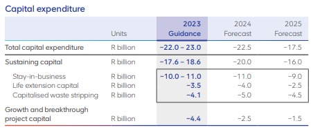 预计2023年总资本支出约为220-230亿南非兰特,可持续资本约为176-186亿南非兰特。