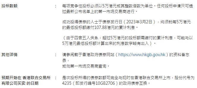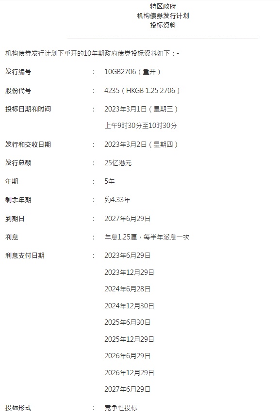 香港金管局表示,透过是次重开债券,将有额外25亿港元的未到期10年期债券(发行编号10GB2706)供投标。该批债券将于2027年6月29日期满,利率为年息1.25厘,每半年派息一次。该批债券于2023年2月20日的指示价格为 90.51,年收益率则为3.660%。