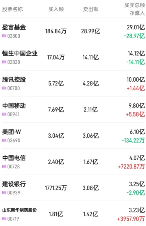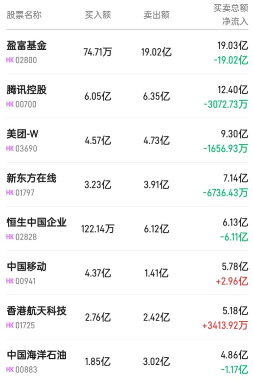 ETF方面,盈富基金(02800)、恒生中国企业(02828)分别遭净卖出47.98亿、20.21亿港元。此外,快手-W(01024)、香港航天科技(01725)分别获净买入1.21亿、3413万港元。而中海油(00883)遭净卖出9057万港元。