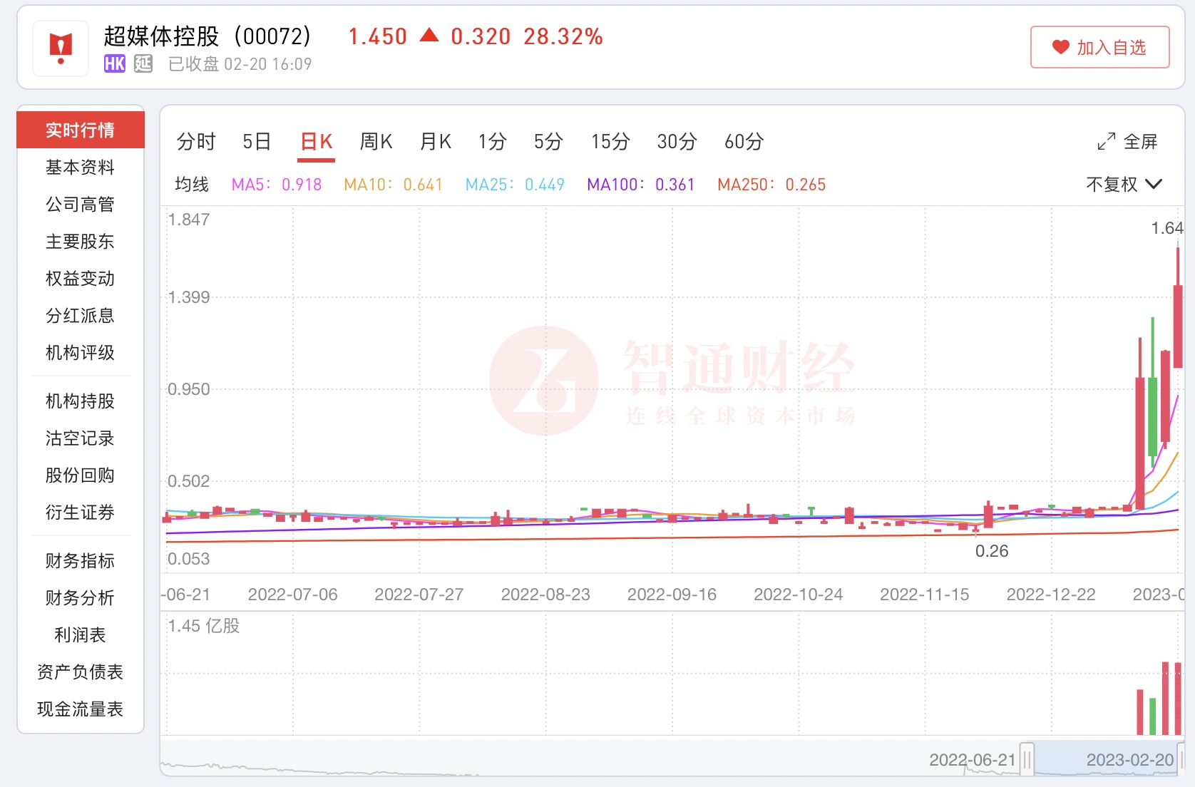 智通财经APP注意到,2月20日,超媒体控股的股价低开高走,盘中一度拉涨超45%,高见1.64港元,创下七年来的新高水平。不过随后公司涨幅有所收窄。截至收盘,其股价上涨28.32%,报于1.45港元,最新总市值为6.36亿港元。