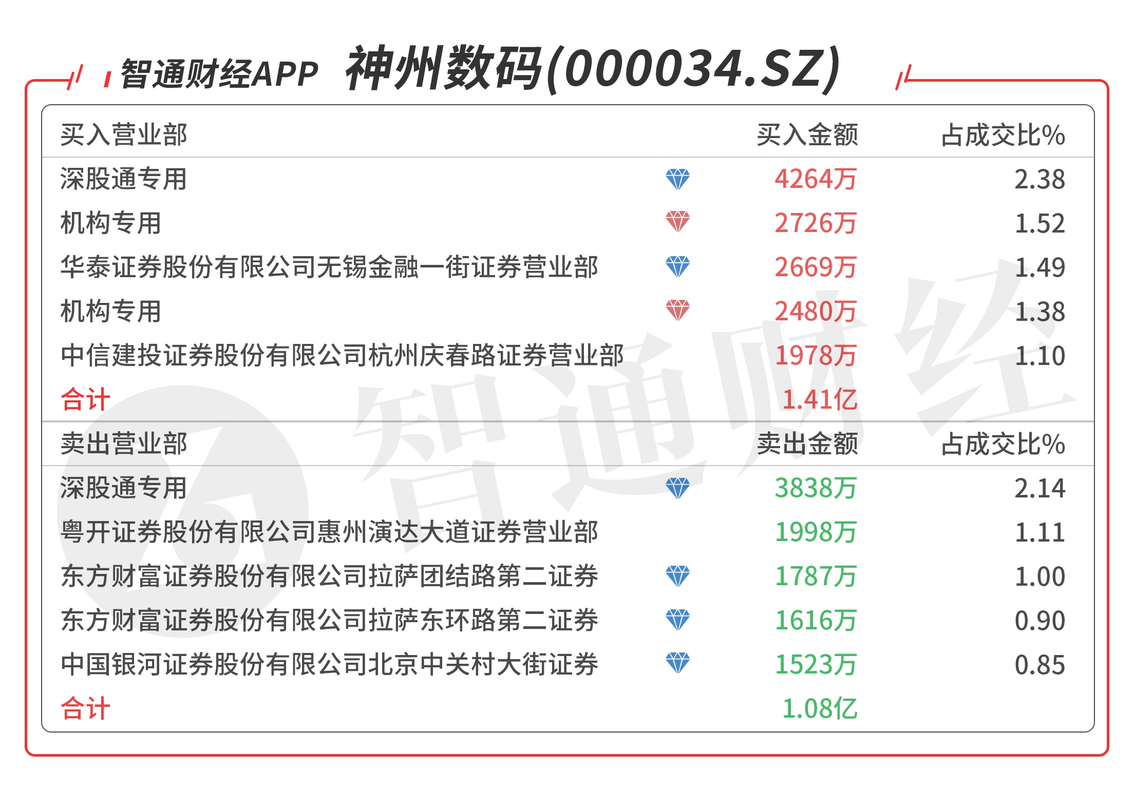 神州数码(000034.SZ):龙虎榜阵容豪华,今日共2家机构席位出现在龙虎榜单上,合计净买入5022万元,深股通对倒净买入426万元,买三是知名游资苏南帮的席位买入2650万元,当日净买入6126万元,注意近期高点的压力。