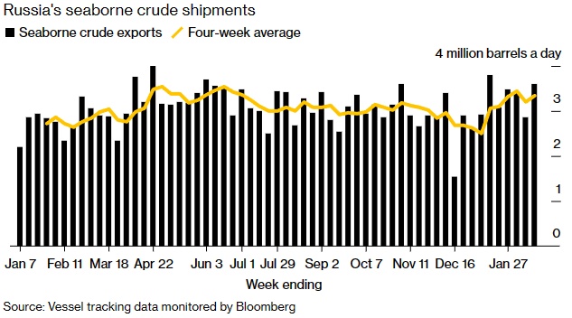 智通财经APP获悉,俄罗斯海运原油出货量在这个全球第三大产油国即将减产之前迎来大幅增长。数据显示,在截至2月17日的一周内,俄罗斯海运原油出货量升至360万桶/日,为一个多月以来最高水平,较上一周增长了26%;截至2月17日的过去四周平均出货量为330万桶/日。
