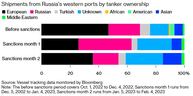 从运输俄罗斯原油的油轮来看,在欧盟对俄罗斯原油实施禁运的两个月后,属于欧盟的油轮所占的比例为36%,较实施禁运一个月后的26%出现明显上升。