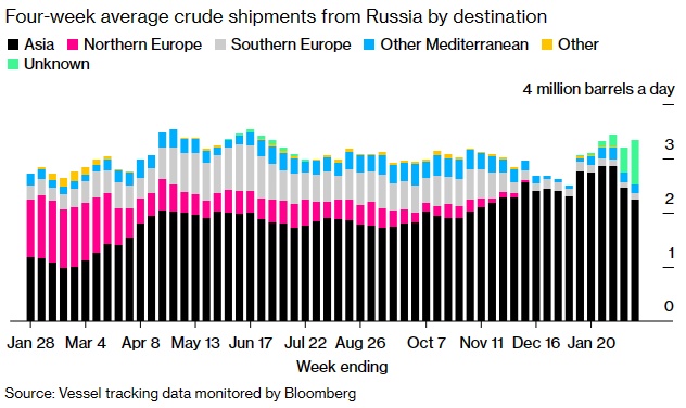 按俄罗斯海运原油出货目的地划分,截至2月17日的过去四周内,运往亚洲地区的平均出货量为220万桶/日,运往南欧的平均出货量为10万桶/日,运往其他地中海地区的平均出货量为20万桶/日,运往未知地区的平均出货量为80万桶/日。