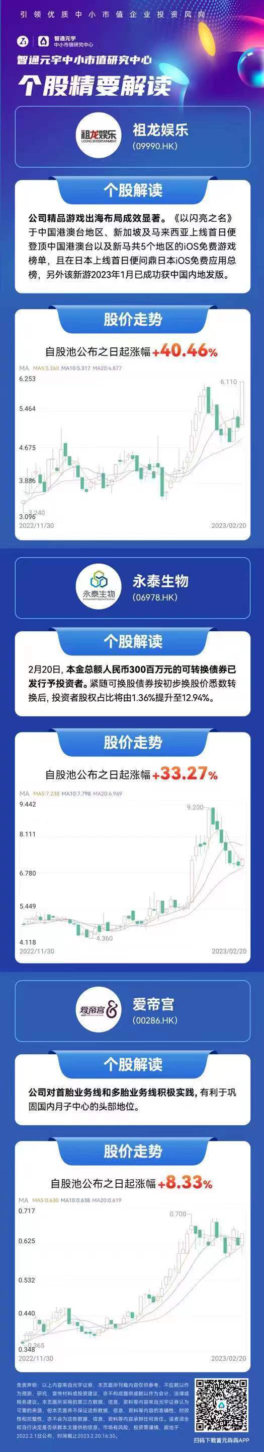 祖龙娱乐(09990)自股池公布之日起涨幅+40.46%。公司精品游戏出海布局成效显著。《以闪亮之名》于中国港澳台地区、新加坡及马来西亚上线首日便登顶中国港澳台以及新马共5个地区的iOS免费游戏榜单,且在日本上线首日便问鼎日本iOS免费应用总榜,另外该新游2023年1月已成功获中国内地发版。