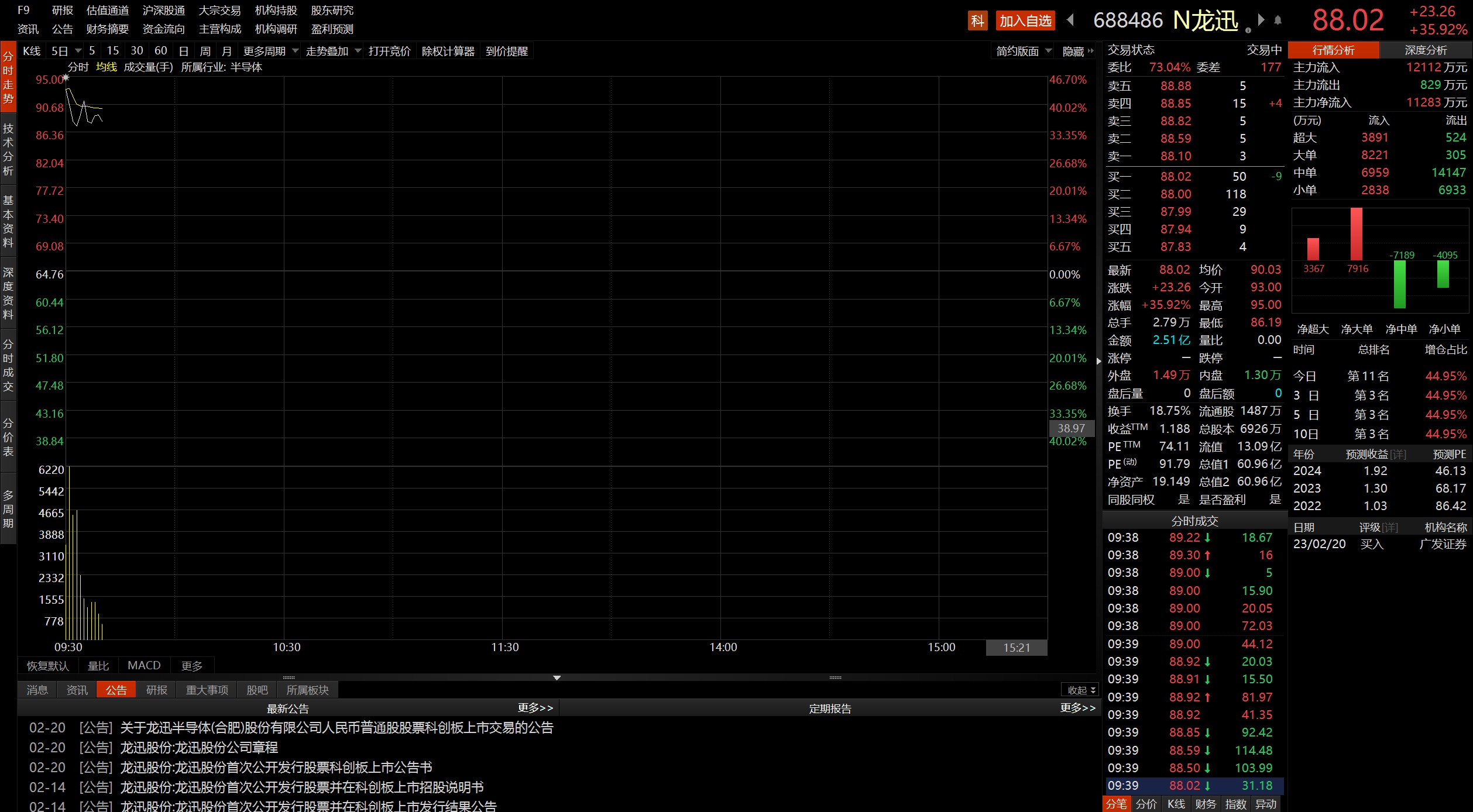 智通财经APP获悉,2月21日,N龙讯(688486.SH)于上交所科创板上市,开盘即涨43.61%,报93元/股。值得一提的是,该股发行价格64.76元/股,发行市盈率为63.14倍。截止发稿,龙讯股份较开盘微跌,涨35.92%,每股报88.02元,按发行价计算中一签(500股),最多赚超1.16万元。