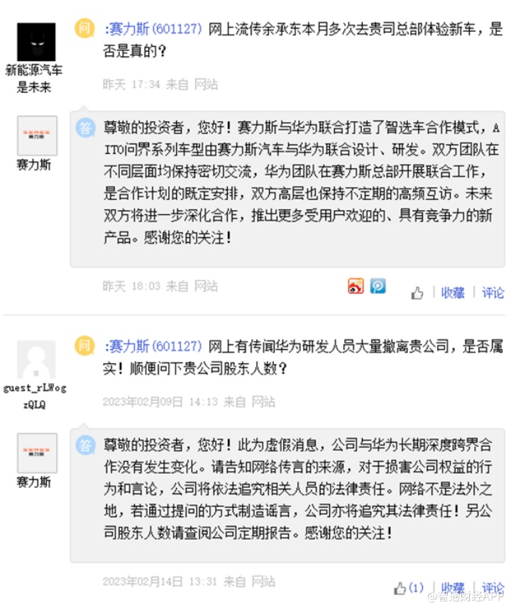 近期更有投资者通过“上证e互动”平台向赛力斯(601127.SH)提问,称余承东在今年2月多次前往赛力斯总部体验新车,而赛力斯官方也对此做出了肯定回答,坐实了余承东对与赛力斯合作造车及具体车型产品的关注,也让外界获知了赛力斯AITO问界系列即将有新车型推出的信息,更明确了华为与赛力斯的合作将持续深化。