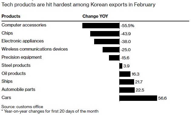 智通财经APP获悉,韩国本月出口持续下滑,在韩国央行将于本周公布利率决议之前加剧了人们对经济前景的担忧。韩国海关总署周二表示,2月份前20天的日均出口同比下降了14.9%。继1月份同期日均出口同比下降8.8%之后,这一最新数据表明全球需求进一步疲软。数据显示,2月1日至20日,韩国整体出口下降2.3%,其中芯片出口暴跌43.9%。