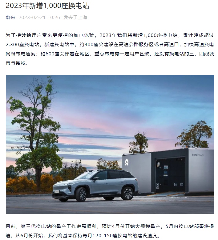 智通财经APP获悉,2月21日,蔚来-SW(09866)官方微信公众号消息称,2023年将新增1000座换电站,累计建成超过2300座换电站。新建换电站中,约400座会建设在高速公路服务区或者高速口,加快高速换电网络布局速度;约600座会部署在城区,重点布局有一定用户基数、还没有换电站的三、四线城市与县城。蔚来还透露,目前第三代换电站的量产工作进展顺利,预计4月份开始大规模量产,5月份换电站部署将提速。从6月份开始,将基本保持每月120-150座换电站的建设速度。