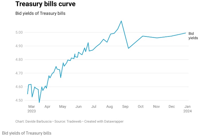 美国国库券收益率曲线显示,投资者对持有8月到期债券的回报率要求更高,这表明美国国库券被认为比其他到期债券风险更高。