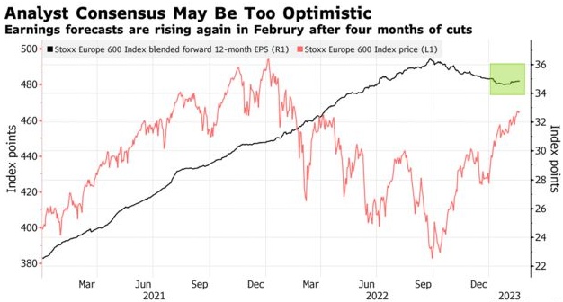 强劲的宏观经济数据、中国需求的复苏以及通胀的缓解为市场提供了主要推动力。自年初以来,包括汽车、零售、旅游和银行在内的周期性股票领涨,得益于暖冬让欧洲经济体避免了更严重的能源危机。与此同时,到目前为止,第四季度财报季一直令人欣慰,促使分析师再次上调每股收益预期。