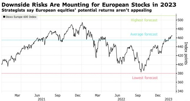 意大利联合信贷银行股票策略师Christian Stocker表示:“价格进一步上涨的空间已经变得稀薄。随着反通胀势头减弱,各大央行的加息幅度超过预期的压力越来越大。”他预计未来斯托克600指数将出现波动,在其470点的年底目标区间内没有太大上涨空间。
