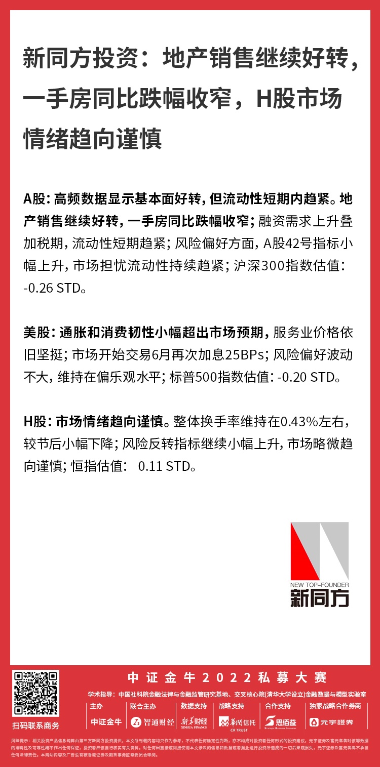 智通财经APP获悉,由元宇证券独家战略支持的中证金牛2022私募大赛于12月1日正式启动,赛事正如火如荼开展。不少参赛机构研究团队及产品主理人就近期市场走势和行业展望发表真知灼见。深圳市新同方投资管理有限公司指出,高频数据显示近期A股市场基本面好转,但流动性短期内趋紧。其中地产销售继续好转,一手房同比跌幅收窄。流动性上,A股近期融资需求上升叠加税期影响,新同方投资认为A股流动性短期趋紧。风险偏好上,A股42号指标小幅上升,市场担忧流动性持续趋紧。沪深300指数估值为0.26STD。