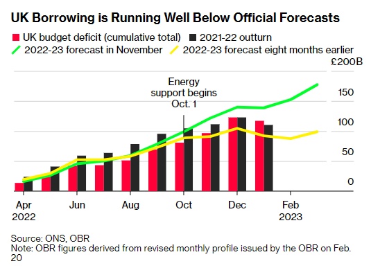 例如,英国1月在能源支持计划上花费了约100亿英镑,并向欧盟支付了与历史关税有关的大额一次性付款。其中能源支持包括直接支付19亿英镑,向北爱尔兰家庭提供约3亿英镑,以及根据能源价格保证,大约80亿英镑流向了家庭和企业。