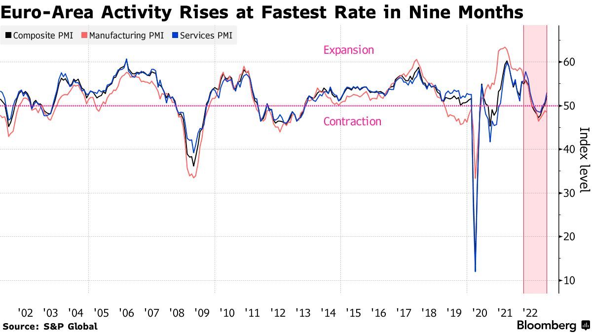 智通财经APP获悉,欧元区2月份的商业活动增长速度为9个月来最快步伐,大幅提高了欧元区在本季度避免衰退的可能性。这一好于预期的表现主要受到服务业推动,在标普全球(S&P Global)统计的欧元区PMI初值数据中,服务业PMI超出经济学家预期,出现了自6月份以来最强劲增幅。随着供应链瓶颈进一步缓解,制造业产出也有所改善。数据显示,欧元区的综合PMI初值升至52.3(前值50.6),经济学家普遍预期为50.7,服务业和制造业PMI初值分别为53和48.5,后者不及预期。