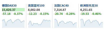 2. 截至发稿,德国DAX指数跌0.37%,英国富时100指数跌0.15%,法国CAC40指数跌0.28%,欧洲斯托克50指数跌0.46%。
