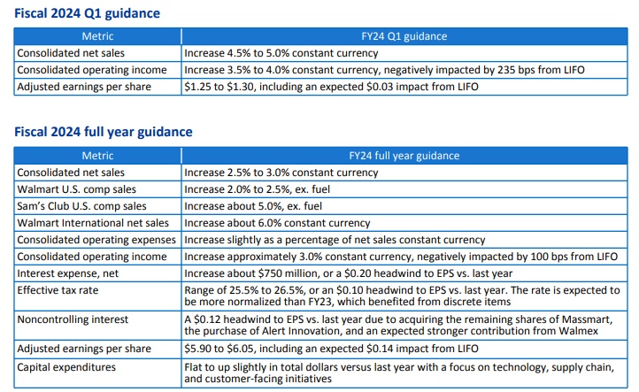 然而,沃尔玛给出的预期却没有令华尔街感到满意。这家大型零售商表示,预计未来财年(2024财年)沃尔玛美国的同店销售额将增长2%至2.5%(不包括燃料)。该零售巨头预计调整后每股收益将在5.90美元至6.05美元之间,不包括燃料,然而华尔街分析师的普遍预期为上行3.8%,至6.53美元;沃尔玛预计预计下一季度,即2024财年第一季度的调整后的每股收益为1.25美元至1.30美元,同样低于华尔街分析师预期的1.37美元。
