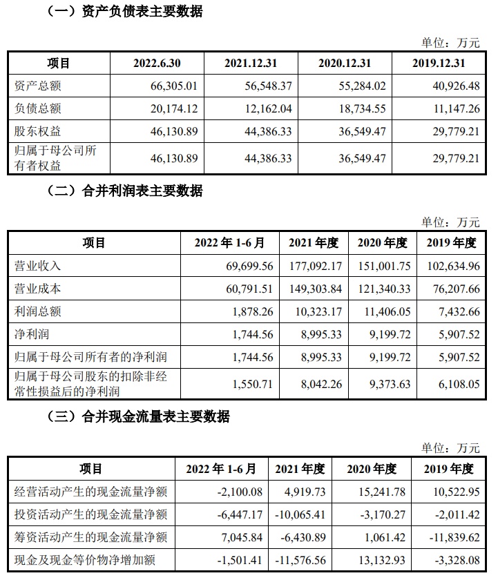 财务方面,于2019年度、2020年度、2021年度及2022年1-6月,该公司分别实现营收约为10.26亿元、15.10亿元、17.71亿元及6.97亿元;同期,净利润分别约为5907.52万元、9199.72万元、8995.33万元、1744.56万元。