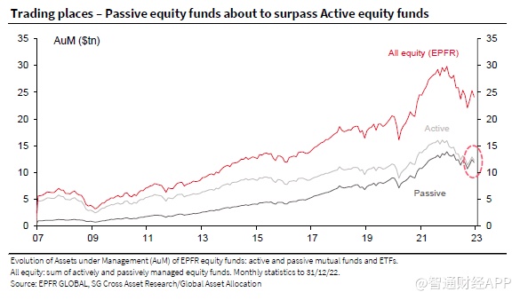 智通财经APP获悉,法国兴业银行的数据显示,被动管理型股票基金即将迎来一个酝酿了十多年的里程碑:在全球范围内,这类产品的净资产即将超过主动管理的同类产品。
