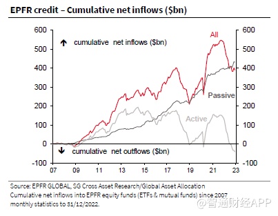 法国兴业银行策略师Arthur Van Slooten及其团队表示,根据EPFR Global的月度数据,“基金业即将跨过一个具有象征意义的里程碑”,时间可能在3月或4月。