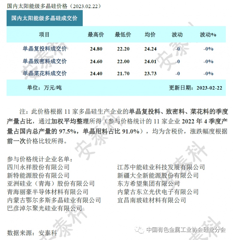 智通财经APP获悉,据硅业分会数据显示,本周国内单晶复投料价格区间在22.2-24.8万元/吨,成交均价为24.24万元/吨,周环比维持不变;单晶致密料价格区间在22.0-24.6万元/吨,成交均价为24.01万元/吨,周环比维持不变。本周硅料均价持稳运行,有新订单成交的企业数量为5家,各企业硅料成交价格区间略有分化,单晶复投料大部分订单价格在24.0-24.8万元/吨,其余订单价格在22.2-23.2万元/吨。近期各硅料企业签单价差本就较大,部分订单以上周区间高价成交,部分订单以区间低价成交,故本周硅料成交均价基本持稳。