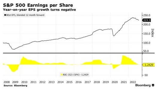 标普500指数12个月远期每股收益同比增长自2021年1月以来首次出现负增长。