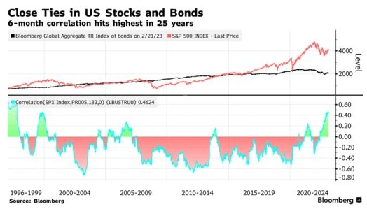 这也导致美股和美债之间的6个月相关性达到了25年来的最高点。由于多元化的影响逐渐减弱,一种资产的抛售可能会加剧另一种资产的走势。