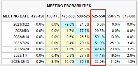 10年期美国国债收益率周二跃升14个基点,至3.95%,因标普全球美国制造业和服务业PMI双双超出预期,交易商加大了对美联储加息的押注。根据芝商所“美联储观察”工具,市场目前押注利率峰值将高于此前FOMC点阵图显示的5.1%这一预期水平。与此同时,市场押注美联储在3月与5月分别各加息25个基点之后,6月再将联邦基金利率上调25个基点的可能性达到了59.1%,而一周前仅为39%。此外,市场对美联储今年将降息的预期已经基本消退。