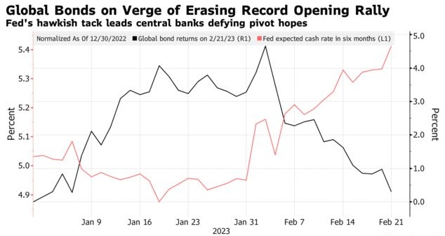 全球债券有望抹去它们在年初所取得的全部涨幅,今年年初全球债券的涨幅是有记录以来最好的。随着全球各大央行坚持其继续加息以抑制通胀的意图,固定收益资产走势逆转,打击了上个月押注政策转向而大举进入市场的债市多头投资者。美国国债周二重挫,因有进一步迹象显示,尽管美联储实行了近一年的紧缩政策,但美国这个全球最大经济体仍显示出韧性。Bloomberg全球债券指数本月截至周二已下跌2.9%,几乎完全回吐了1月份3.3%的涨幅。1月份的涨幅是自1990年推出该指数以来往年同期表现最好的一个月。