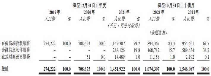于2021年,九方财富推出了金融信息软件服务。据了解,该服务主要是向投资经验较丰富及有更复杂需求的客户,提供专业、及时与广泛的金融市场有关资讯、数据分析以及投资决策支援,从而扩大其资深个人投资者客户群。业绩方面,2021年及2022年前10月,该业务的收入分别为2.88亿元、5.89亿元,收入占比分别为19.8%、38.2%,呈快速放量的趋势。