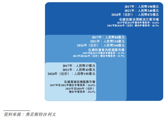 不过,若切换到行业视角,九方财富所处的赛道或许仍存在较大的成长空间。根据弗若斯特沙利文的资料,2021年,我国在线高端投教服务市场、在线投资者内容服务市场以及在线投资决策解决方案市场的规模分别为43亿元、80亿元、198亿元,预计至2026年,上述市场的规模分别将达到155亿元、346亿元、872亿元,对应复合年增长率约为29.2%、22.7%、20.7%,潜在增速仍较为可观。