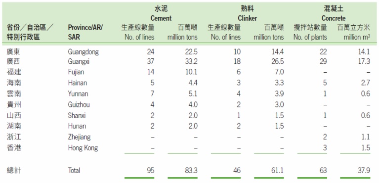 于二零二二年六月三十日,本集团经营95条水泥粉磨线及46条熟料生产线,水泥及熟料的年产能分别为8,330万吨及6,110万吨,以及拥有63座混凝土搅拌站,混凝土年产能为3,790万立方米。该等生产设施的地点及其各自产能如下: