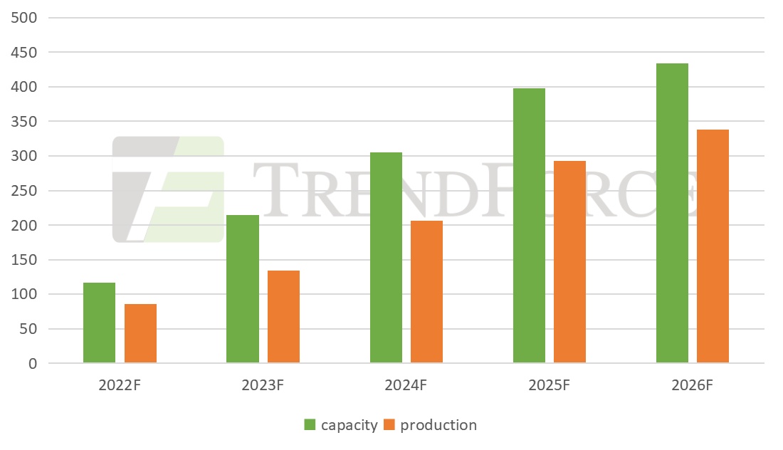 图:2022-2026年全球硅料产能、产量变化趋势,Unit: 万吨