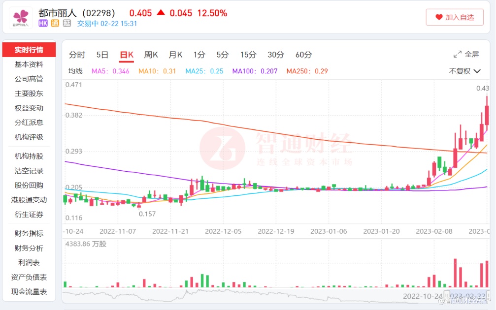 智通财经APP注意到,2月22日盘中,都市丽人股价一度上涨至0.43港元,涨幅近20%,月内累计最高涨幅达到115%。若从2022年11月0.157港元低点算起,都市丽人股价近3个月的最高涨幅达到173.9%。