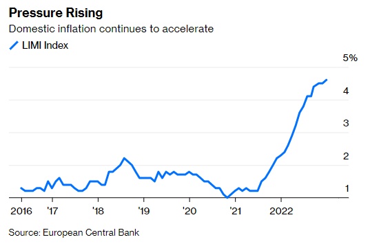 欧元区也是如此。去年6月,三位欧洲央行经济学家以不同的方式研究了大致相同的问题。他们通过观察进口强度为18%或更低的商品的通胀来计算国内通胀压力。由此得出的指数被他们称为LIMI指数,是区分进口通胀压力和国内通胀压力的一种方式。这种方法并非没有漏洞:虽然进口强度很低,但部分国内生产的商品和服务仍受到全球市场的影响。尽管如此,研究结果的主旨似乎是合理的。该指数显示,国内通胀压力仍在快速攀升。