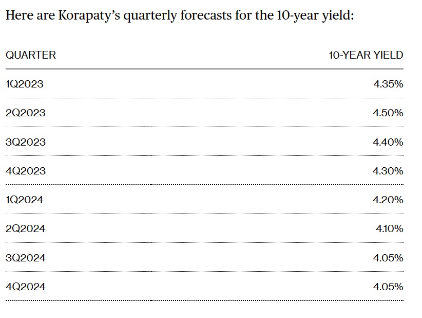 高盛的首席利率策略师Praveen Korapaty去年12月预计,10年期美债收益率在2023年第二季度将跃升至4.5%,随后在第三季度跌至4.4%,预计2023年最终以4.3%收尾。Korapaty预计2024年将呈现出回落趋势。