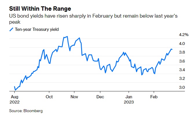 市场对于美联储加息的预期升温,以及美联储官员们的鹰派发言令美国国债承压(收益率变动与价格趋势相反)。其中,短端的美债收益率领涨,2年期美债收益率回升至去年11月4.7%的峰值,非常接近全球金融危机以来的最高水平。