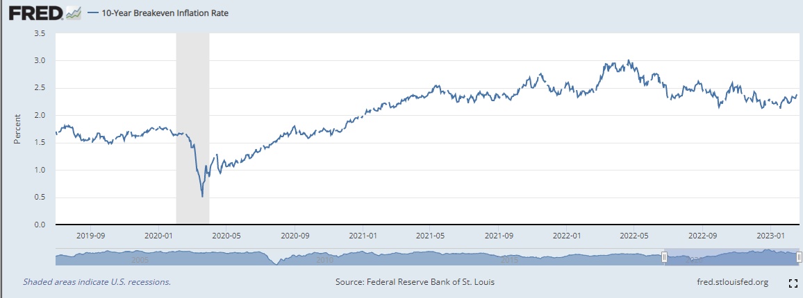 在这些背景之下,华盛顿两党围绕提高债务上限的问题仍然争论不休,再加之通胀可能难以在短时间内降温,10年期美债收益率似乎难以出现大幅降温。反映债券市场交易员们对于未来10年期通胀率预期的10年期盈亏平衡通胀率在近期出现大幅回升,升幅创下自去年10月“全球资产定价之锚”大幅回升以来的最大幅度,反映出债市预期高企的通胀难以迅速下行。