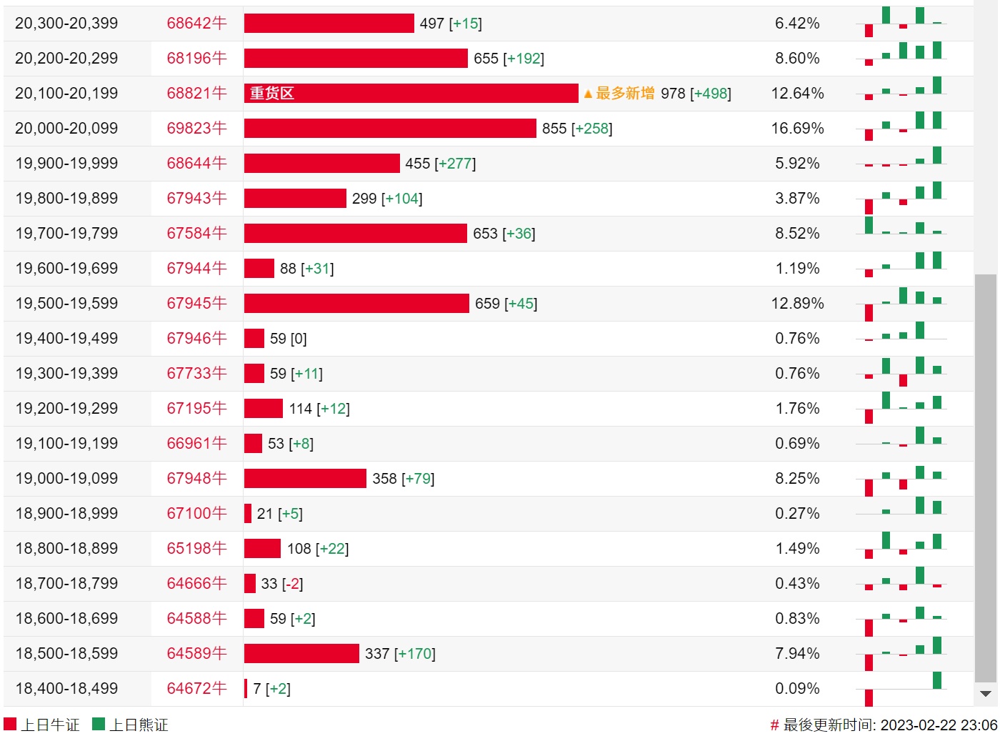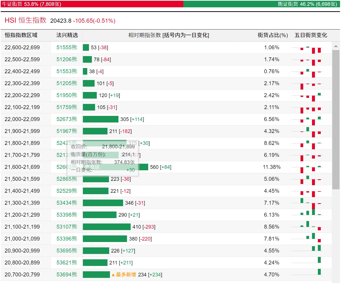 法兴恒指牛熊证街货分布图中的数据显示,熊证街货重货区在21600-21699区间,该区间最新熊证数量为560张,较上一交易日增加84张;最多新增在20700-20799区间,该区间最新熊证数量为234张,较上一交易日增加234张。