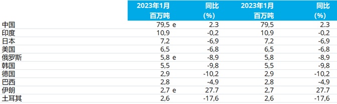 智通财经APP获悉,2月23日,世界钢铁协会数据显示,2023年1月全球63个纳入世界钢铁协会统计国家的粗钢产量为1.453亿吨,同比下降3.3%。2023年1月,中国粗钢预估产量为7945万吨,同比提高2.3%。