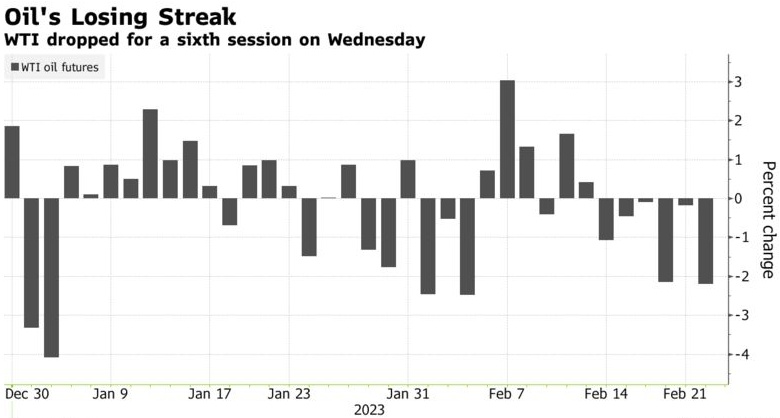 周三,WTI原油价格下跌约3%,连续第六个交易日走低,交易价格接近每桶74美元。美联储上次会议的纪要显示,尽管几乎所有官员都支持放慢加息步伐,官员们预计将进一步加息以抑制通胀。