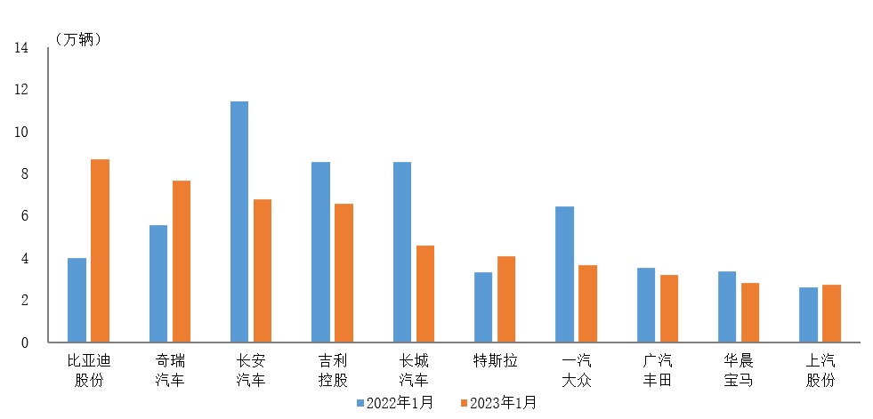 智通财经APP获悉,据中国汽车工业协会统计分析,2023年1月,销量排名前十位的SUV生产企业共销售51万辆,占SUV销售总量的67.2%。在上述十家企业中,与上年同期相比,比亚迪股份(01211)增速最为显著,奇瑞汽车和特斯拉(TSLA.US)呈两位数增长,上汽股份小幅增长,其他企业呈不同程度下降。