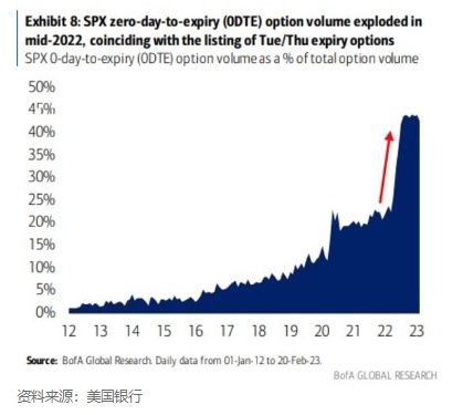 自2022年年中以来,0DTE期权的兴起经常被指责放大了基础资产的波动。据美国银行估计,目前此类合约平均占该指数日交易量的40%至45%,高于2021年的21%。
