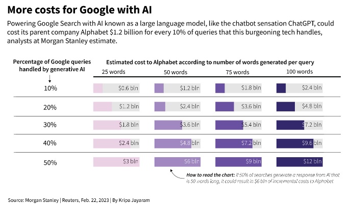 摩根士丹利估计,谷歌去年的3.3万亿次搜索查询每次的花费大约为五分之一美分,但这个数字在今年将会增加,具体取决于AI必须生成的文本长度。例如,分析师预测,如果像ChatGPT这样的人工智能能够以50个字以内的回复处理一半的问询量来计算,到2024年,谷歌的费用支出将增加近60亿美元。