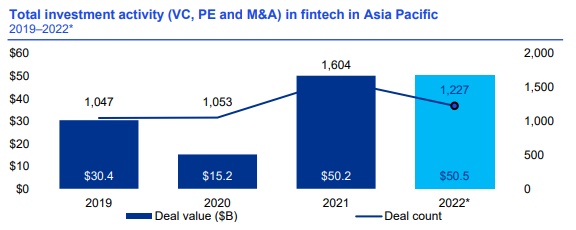 智通财经APP获悉,毕马威最新一期《金融科技动向》显示,亚太区金融科技投资从2021年的502亿美元,轻微上升至2022年的505亿美元,创历史新高,但2022年下半年并没有超过10亿美元的并购交易。于亚太区方面,针对财富较少客群的资产管理业务亦受到关注,相关业务为传统财富管理公司目标客户以外的个人客户提供独特的投资机会。投资者与金融科技企均专注于B2B金融科技产品的开发和增长;而支付领域则持续吸引着域内的最大金额交易。