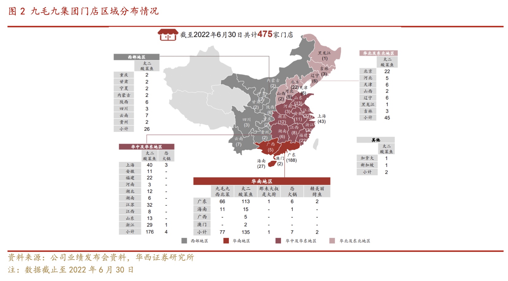 截至 2022 年上半年,九毛九集团餐厅网络已覆盖中国 93 座城市以及海外 2 座城市,与 100 多家购物中心合作超过五年,除去已出售的 2 颗鸡蛋煎饼,公司门店总数达 475 家。截至 2022 年 11 月 3 日,公司门店总数进一步增至 516 家。