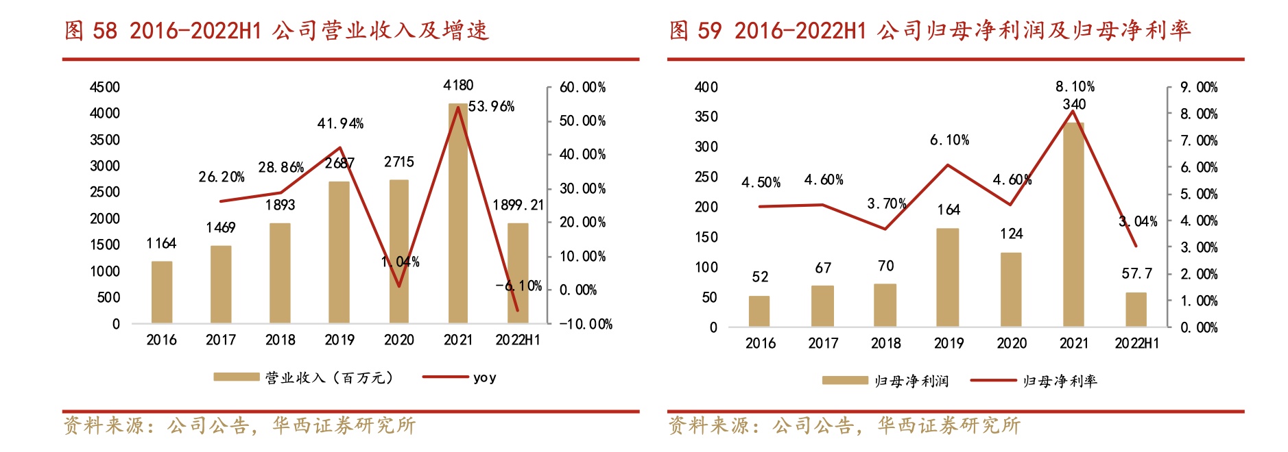 一直以来,九毛九的业绩表现都颇为亮眼。自2017年起,公司营收节节攀升。其中营收由2017年的14.69亿元增加至2021年的41.8亿元,年复合增长率为29.88%。与此同时,公司归母净利处于上行趋势。2017-2021年,公司的归母净利分别为6686.1万元、6964.8万元、1.64亿元、1.24亿元及3.40亿元。