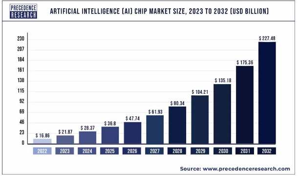 另一研究机构Precedence Research在今年发布的最新研报显示,该机构表示,经过全方位测算后的2022年全球人工智能(AI)芯片市场规模仅仅为168.6亿美元,预计到2032年将达到惊人的2274.8亿美元左右,从2023年到2032年的复合年增速为29.72%,该机构表示主要因各行业对深度学习和人工智能(AI)部署的需求不断增加,这推动了人工智能芯片市场爆炸式增长。