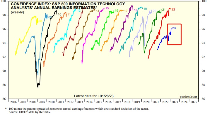 市场研究机构Yardeni统计的市场预期数据显示,虽然分析师们对于标普500指数中的IT板块“基于盈利水平的信心指数”仍然严重低于2022年,但近期已经呈现出非常很明显的边际改善趋势,即市场开始提前定价2023复苏预期。
